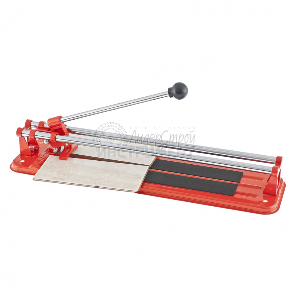 Предназначен для резки керамической кафельной плитки толщиной до 16 мм и длиной от 400 до 600 мм в зависимости от модели. Режущим элементом является ролик из твердого сплава ВК-8. Основание – цельнолитая станина, благодаря которой обеспечивается устойчивость инструмента на верстаке и абсолютная неподвижность разрезаемой плитки на обрезиненной поверхности станины. Две трубчатые направляющие изготовлены из хромированной стали с антикоррозийной пропиткой, что обеспечивает свободный ход каретки по направляющим в процессе резки. Каретка представляет собой массивный цельнолитой закрытый корпус. Благодаря шариковым подшипникам она перемещается по направляющим свободно даже при их загрязнении. Отсутствие люфтов (зазоров) в каретке позволяет выполнять рез максимально точно. Модели данных плиткорезов снабжены металлическим угольником для регулировки размера и дополнительной фиксации отрезаемой заготовки.