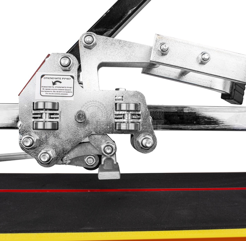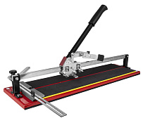Облегченный монорельсовый плиткорез, выполнен из никелированной стали с порошковым защитным покрытием. Ручка оснащена двумя сверхпрочными лапками для деликатного разлома на разной ширине плитки. Благодаря механизму каретки, оснащенной подшипниками, плиткорез имеет плавный ход, что позволяет выполнять более точную безошибочную резку. Откидной боковой упор-линейка позволяет позиционировать плитку под разным углом для удобства диагональных резов. Плиткорез оснащен режущим  роликом на подшипнике. Для предотвращения скольжения плитки и комфортного разлома на рабочей поверхности стола полиуретановое покрытие.