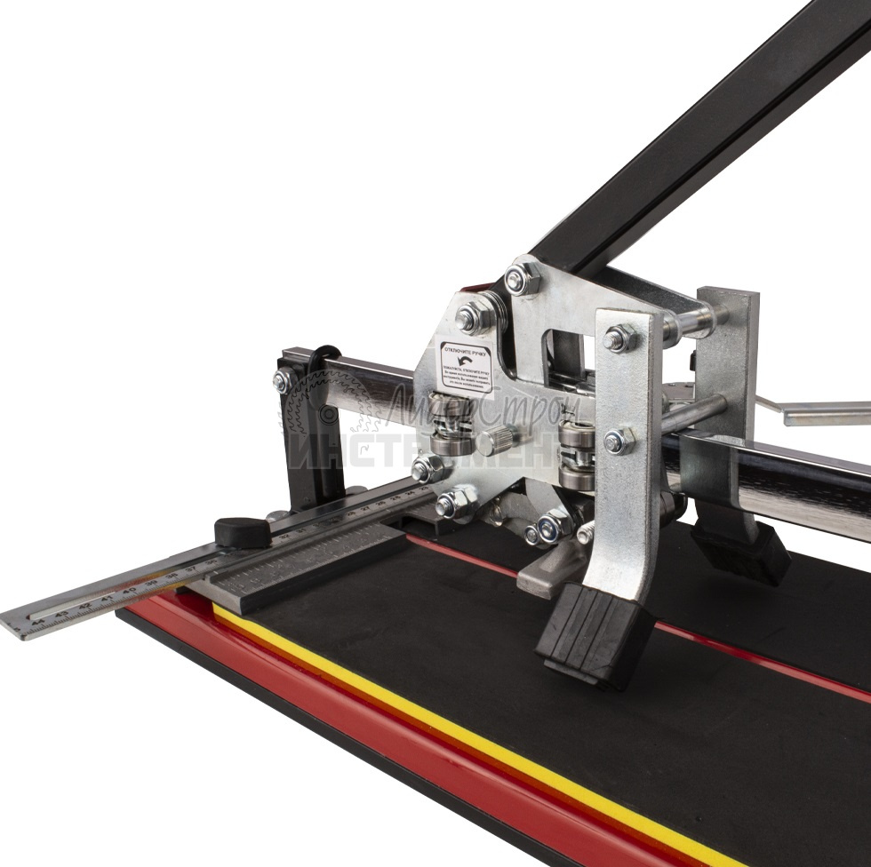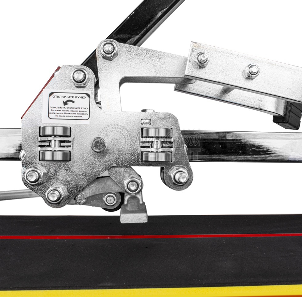 Последняя разработка Mtx. Плиткорез имеет только один направляющий рельс - двутавровую рейку из специального стального сплава. Несущая каретка инструмента охватывает рельс с двух сторон и передвигается посредством шарикоподшипникового механизма. Прижимной обхват рельса каретки регулируется специальным болтами, в результате достигается полное отсутствие люфта между кареткой и рельсом и максимальная устойчивость рукоятки при резке. Специальный сплав и покрытие рейки обеспечивает надежное сцепление шарикового механизма с рельсом и исключает проскальзывания каретки при работе. Стоит особо отметить легкий ход рукоятки плиткореза. Станина традиционной формы из алюминиевого сплава значительно облегчает и придает инструменту мобильность