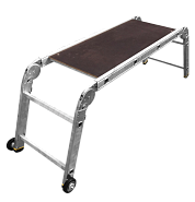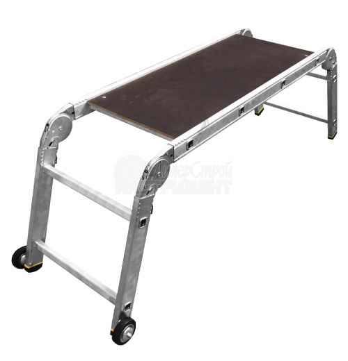водостойкий нескользящий настил из ламинированной фанеры легко снимается, при этом подмости трансформируются в шарнирную лестницу