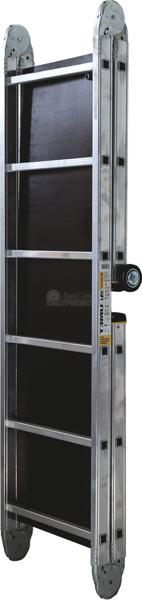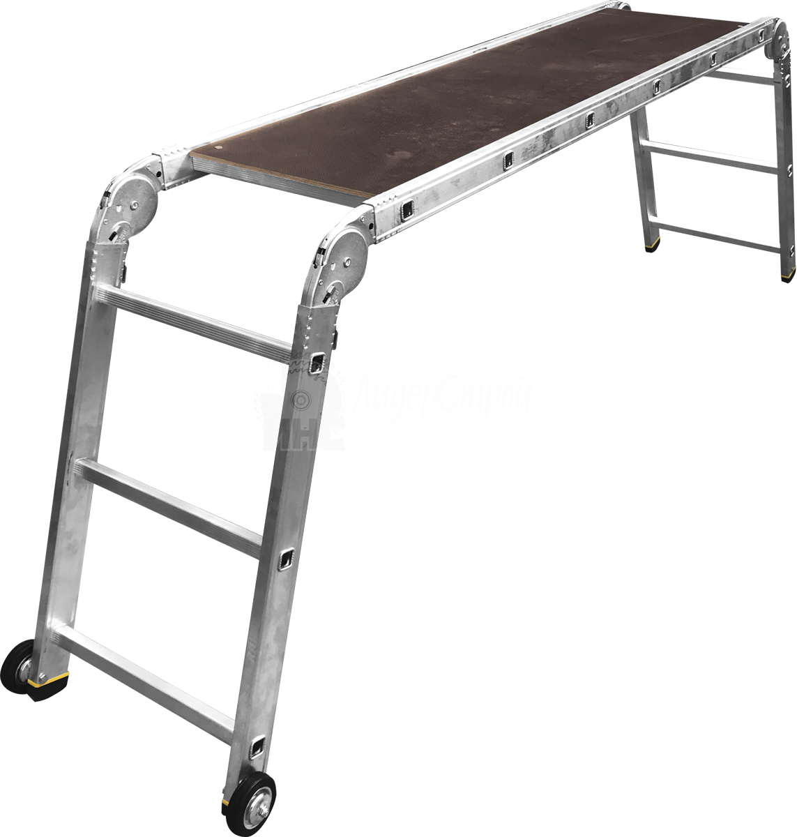 водостойкий нескользящий настил из ламинированной фанеры легко снимается, при этом подмости трансформируются в шарнирную лестницу