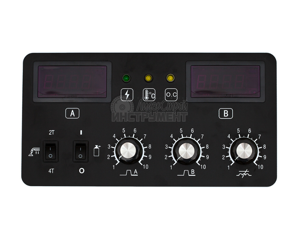 Напряжение и сила тока регулируются, обеспечивая создание ровного шва. Помимо основных параметров на панели управления находятся светодиодный индикатор подключения к сети и индикатор перегрева.