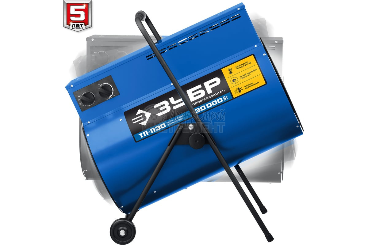Электрическая тепловая пушка ЗУБР Профессионал 30 кВт ТП-П30 с питанием от трехфазной электрической сети эффективна для быстрого и направленного обогрева складских и производственных помещений, ангаров и мастерских, благодаря большой площади нагревательных элементов и мощным двигателем вентилятора.