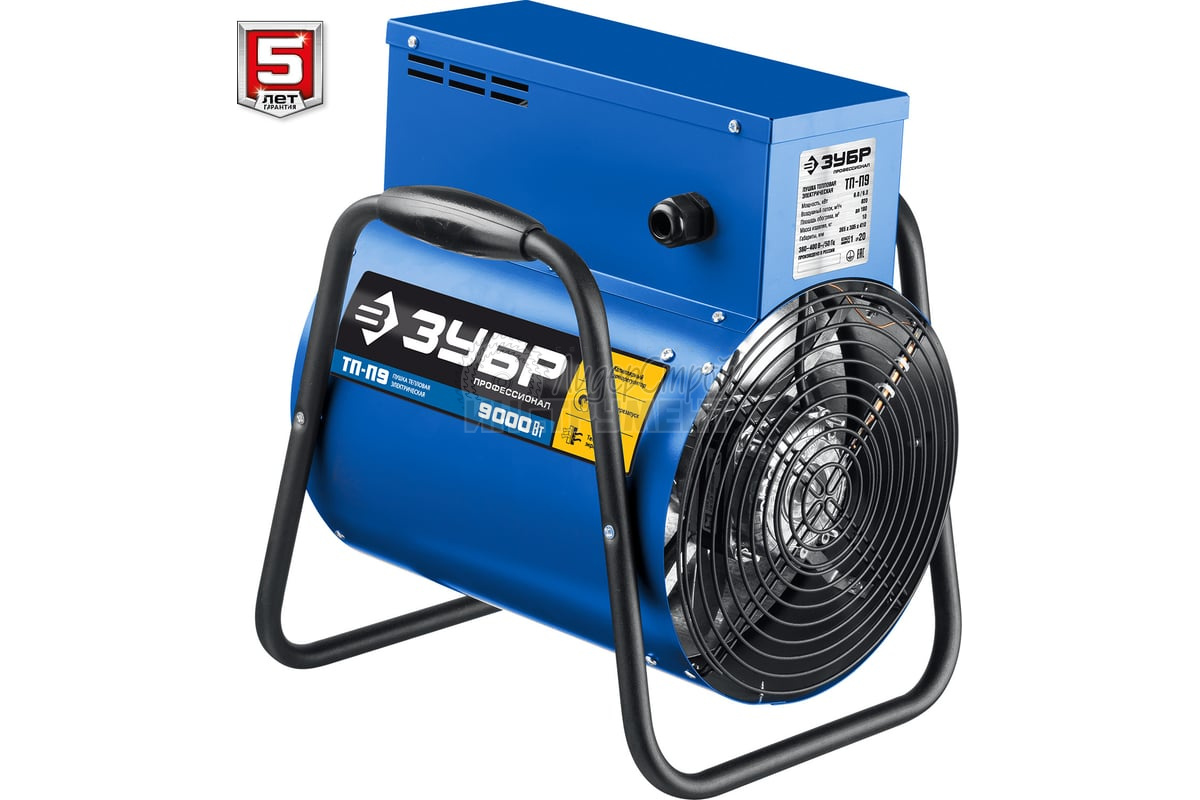 Электрическая тепловая пушка ЗУБР Профессионал 9 кВт ТП-П9 с питанием от трехфазной электрической сети эффективна для быстрого и направленного обогрева складских и производственных помещений, ангаров и мастерских, благодаря большой площади нагревательных элементов и мощным двигателем вентилятора.