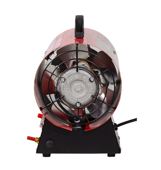 Теплопушка работает на сжиженном газе. Это может быть пропан, бутан или смесь пропан-бутан. Модель оснащена пьезоэлектрическим элементом для удобного розжига топлива, регулятором давления, биметаллическим термодатчиком для контроля пламени, имеет защиту от перегрева. В случае угасания пламени газ сразу перестает поступать в горелку, при нагреве до критической температуры +110 градусов автоматически отключается электрика. Принцип работы тепловой пушки заключается в подаче в устройство холодного воздуха посредством мощного вентилятора, его нагреве и последующем перемешивании холодных и горячих потоков для быстрого обогрева окружающего пространства. При необходимости подачу топлива можно перекрыть и использовать устройство для вентилирования помещения. Газовая теплопушка весит 4,8 кг и для более удобной переноски оснащена ручкой.