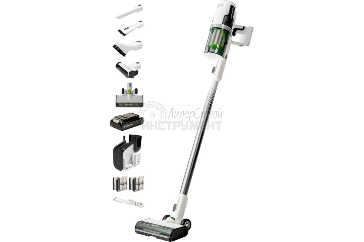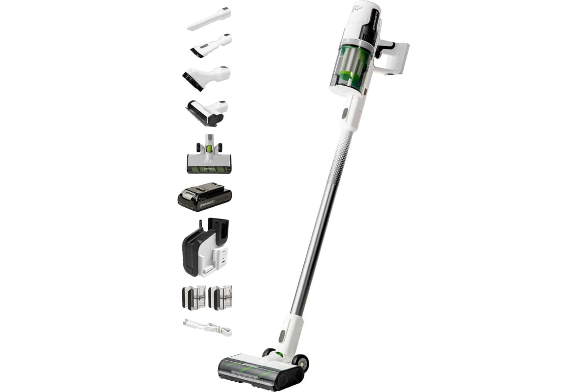 Аккумулятор совместим со всеми инструментами Greenworks на 24 вольта. Ручной пылесос оснащен универсальными насадками для уборки углов, лестниц и щелей.