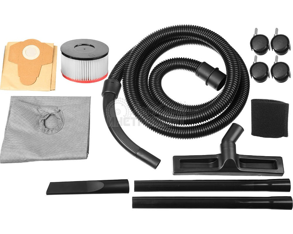 бумажный мешок, фильтры HEPA и для влажной уборки, пластиковый гофрошланг, трубка составная, насадки универсальная и щелевая, 4 колеса, крепеж. набор