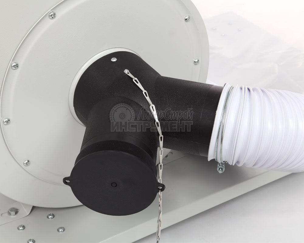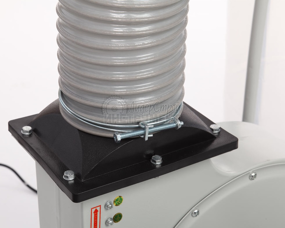 На основании размещен корпус установки с асинхронным двигателем и стойками. Мощность двигателя 1500 Вт., крыльчатка металлическая. К выходному патрубку установки крепится стальной отвод прямоугольного сечения, по которому воздух попадает в разделительный корпус. На входной патрубок вытяжки (Ø125 мм) устанавливается адаптер с двумя входами по 100 мм, поэтому вытяжку можно подключить сразу к двум точкам удаления отходов резания, мощности для этого достаточно.