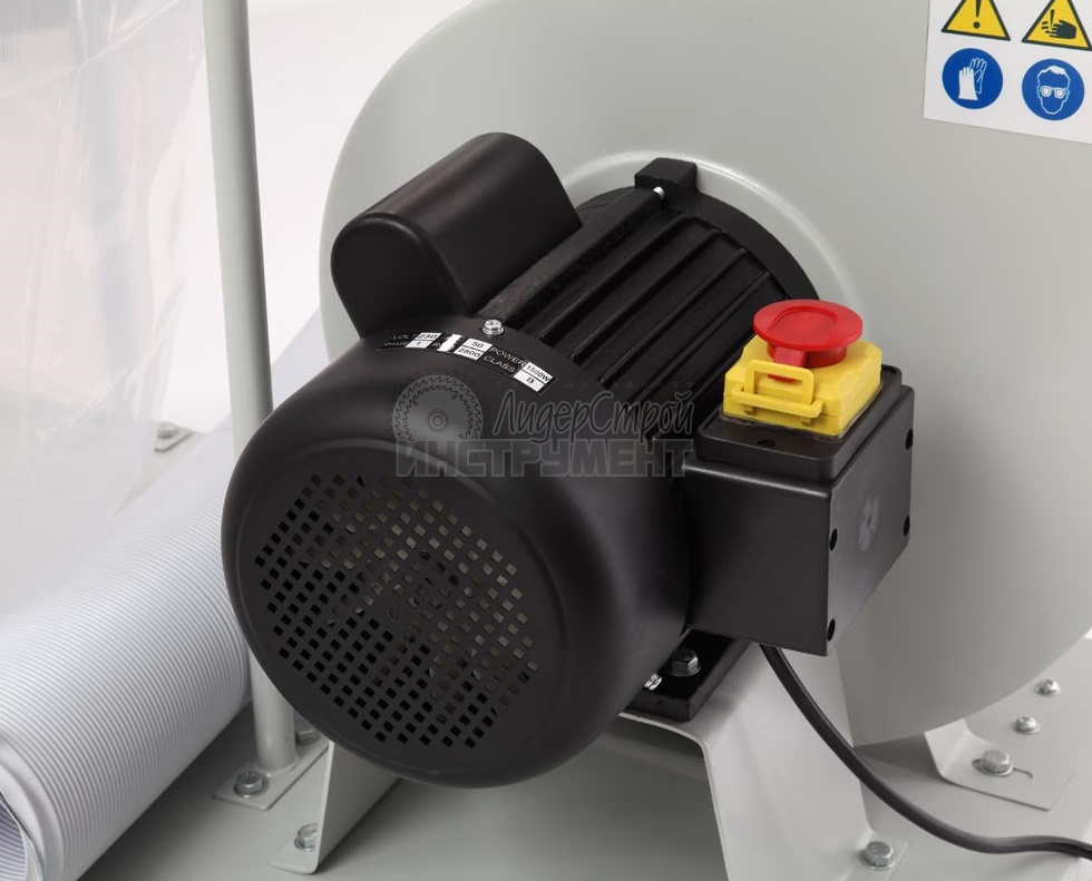 На основании размещен корпус установки с асинхронным двигателем и стойками. Мощность двигателя 1500 Вт., крыльчатка металлическая. К выходному патрубку установки крепится стальной отвод прямоугольного сечения, по которому воздух попадает в разделительный корпус. На входной патрубок вытяжки (Ø125 мм) устанавливается адаптер с двумя входами по 100 мм, поэтому вытяжку можно подключить сразу к двум точкам удаления отходов резания, мощности для этого достаточно.