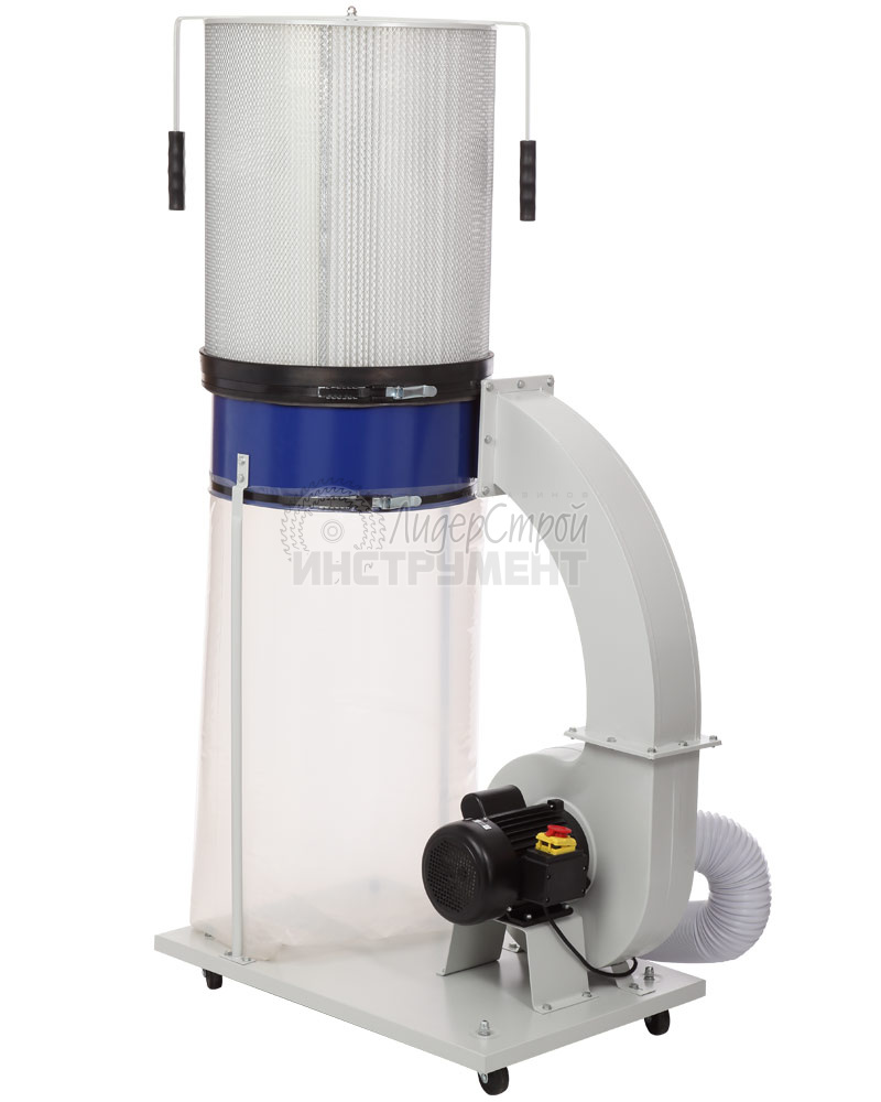 На платформе-основании размещены корпус установки с двигателем и стойки. К выходному патрубку крепится отводящий пластиковый армированный шланг диаметром 125 мм, по которому воздух попадает в разделительный корпус. Фильтр-мешок и стружкосборник находятся на одной вертикальной оси и крепятся к корпусу-разделителю с помощью двух зажимов. Мешок из плотного нетканого материала подвешивается на крючок опоры. В комплект поставки входит 4-х секционный переходник. Вытяжку легко перемещать, на нижней части основания имеются четыре поворотных колеса.