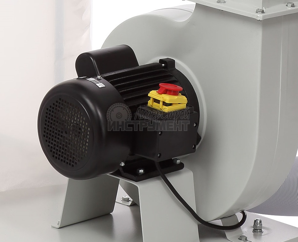 На основании размещены корпус установки и стойки. Двигатель асинхронный, с металлической крыльчаткой.  К выходному патрубку установки крепится стальной отвод прямоугольного сечения, по которому воздух попадает в разделительный корпус. На входной патрубок вытяжки (Ø125 мм) устанавливается адаптер с двумя входами по 100 мм, поэтому вытяжку можно подключить сразу к двум точкам удаления отходов резания, мощности для этого достаточно.