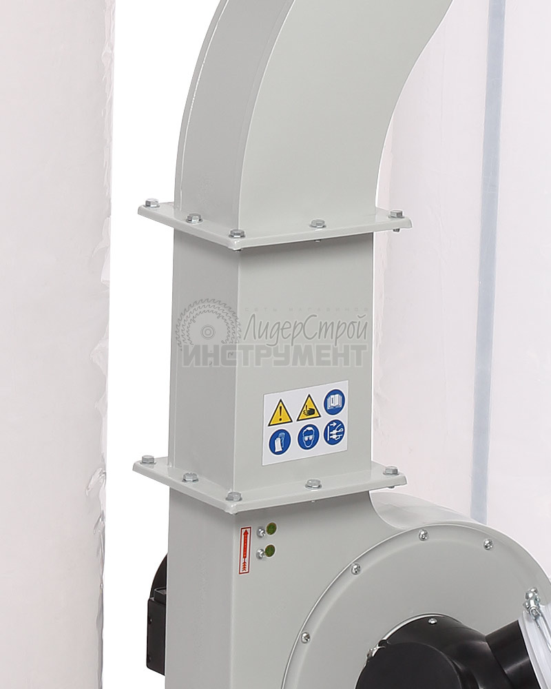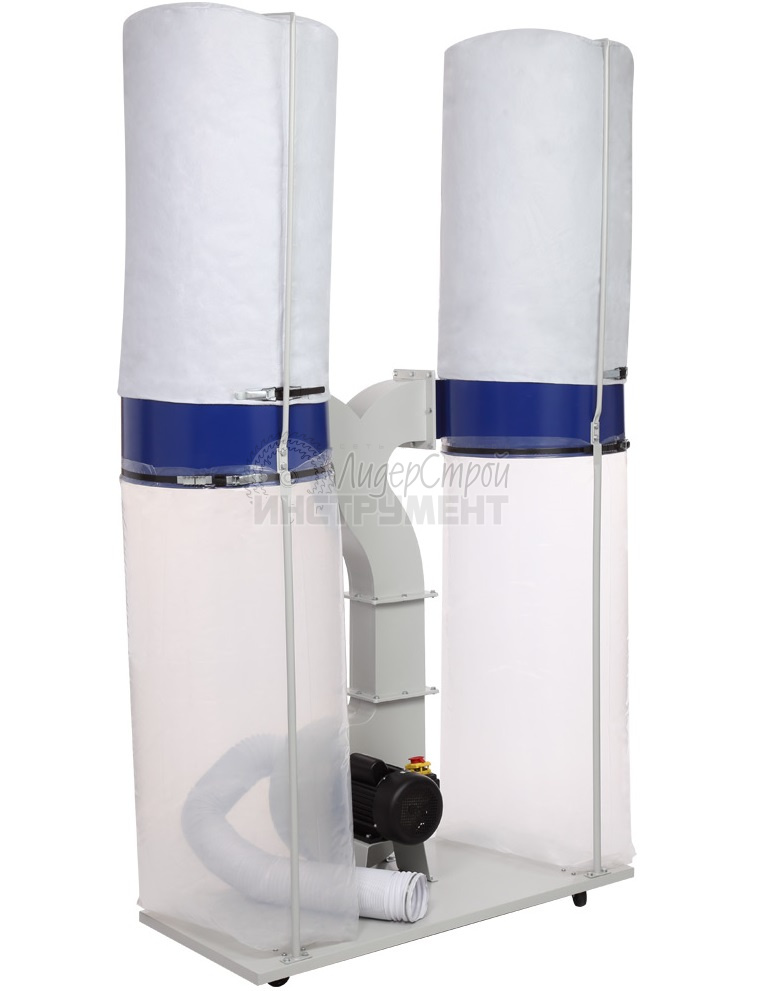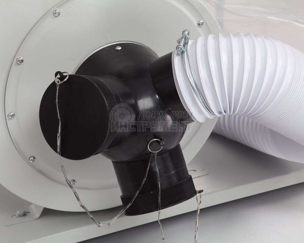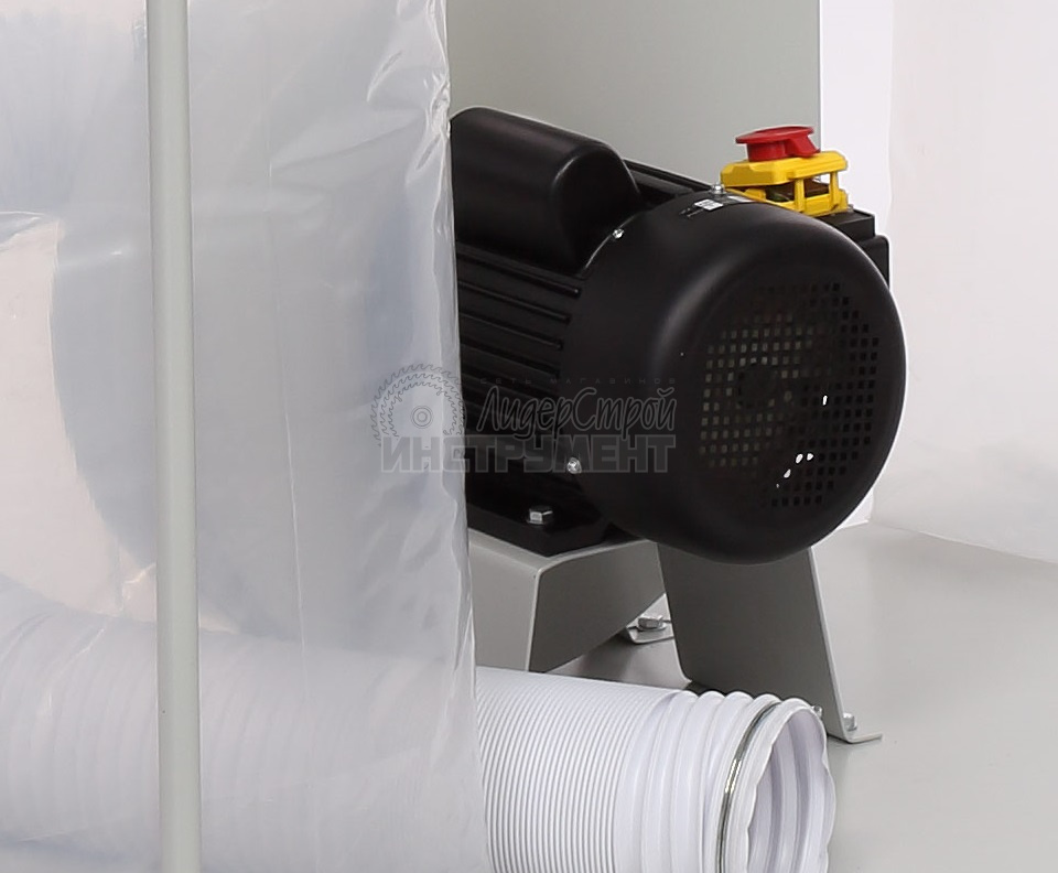 На основании размещен корпус установки с асинхронным двигателем и стойками. Мощность двигателя 1500 Вт., крыльчатка металлическая. К выходному патрубку установки крепится стальной отвод прямоугольного сечения, по которому воздух попадает в разделительный корпус. На входной патрубок вытяжки (Ø125 мм) устанавливается адаптер с двумя входами по 100 мм, поэтому вытяжку можно подключить сразу к двум точкам удаления отходов резания, мощности для этого достаточно.