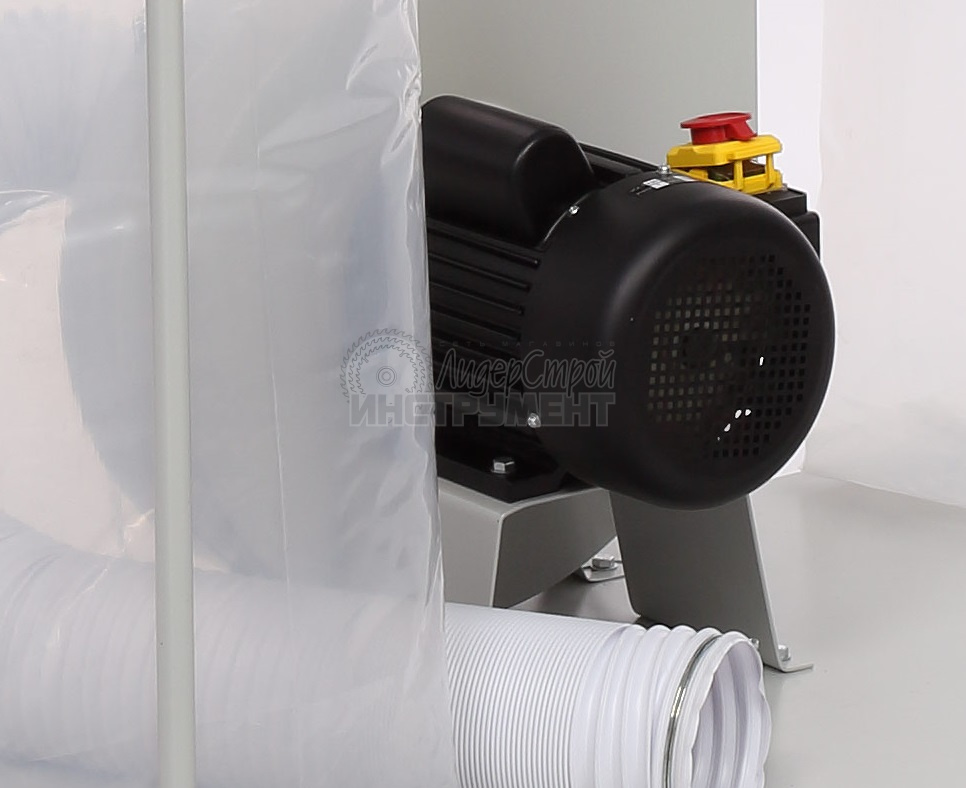 На основании размещен корпус установки с асинхронным двигателем и стойками. Мощность двигателя 1500 Вт., крыльчатка металлическая. К выходному патрубку установки крепится стальной отвод прямоугольного сечения, по которому воздух попадает в разделительный корпус. На входной патрубок вытяжки (Ø125 мм) устанавливается адаптер с двумя входами по 100 мм, поэтому вытяжку можно подключить сразу к двум точкам удаления отходов резания, мощности для этого достаточно.