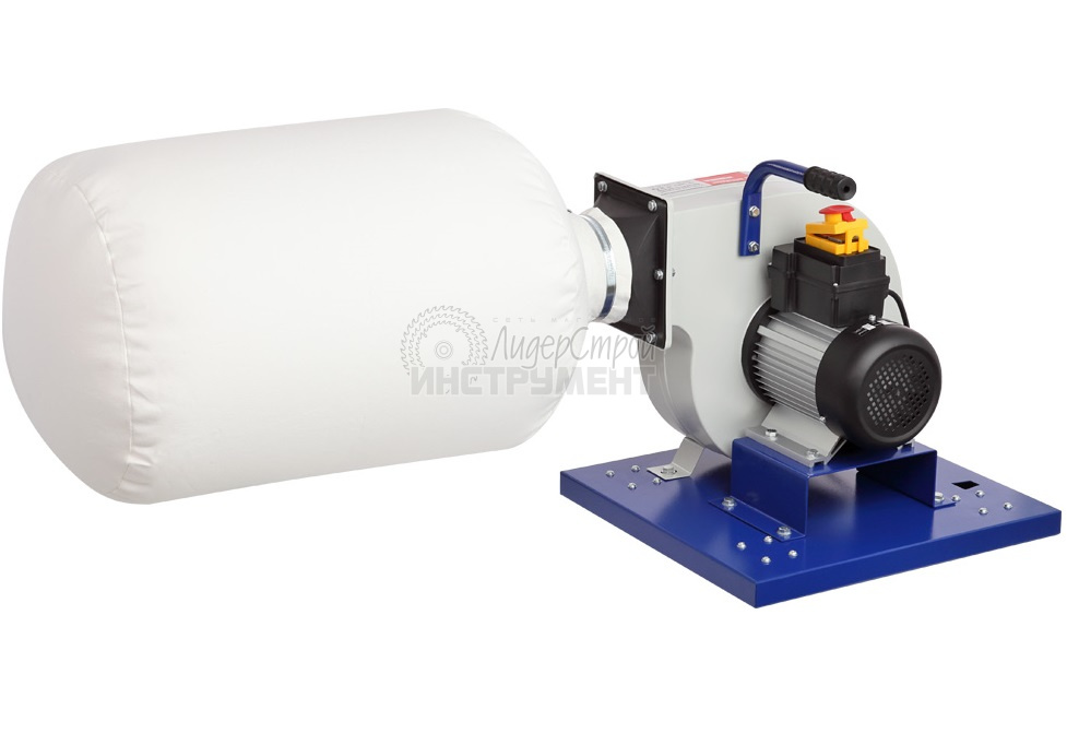 На основании размещен корпус установки с асинхронным двигателем и стойками. Мощность двигателя 1500 Вт., крыльчатка металлическая. К выходному патрубку установки крепится стальной отвод прямоугольного сечения, по которому воздух попадает в разделительный корпус. На входной патрубок вытяжки (Ø125 мм) устанавливается адаптер с двумя входами по 100 мм, поэтому вытяжку можно подключить сразу к двум точкам удаления отходов резания, мощности для этого достаточно.