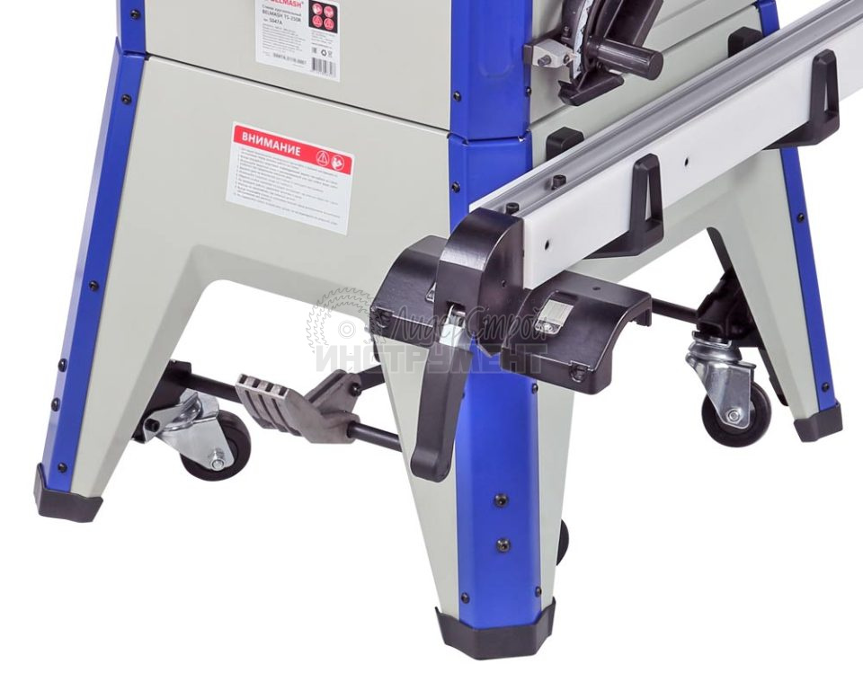 Перемещение станка осуществляется благодаря удобной системе выдвигаемых поворотных колес.