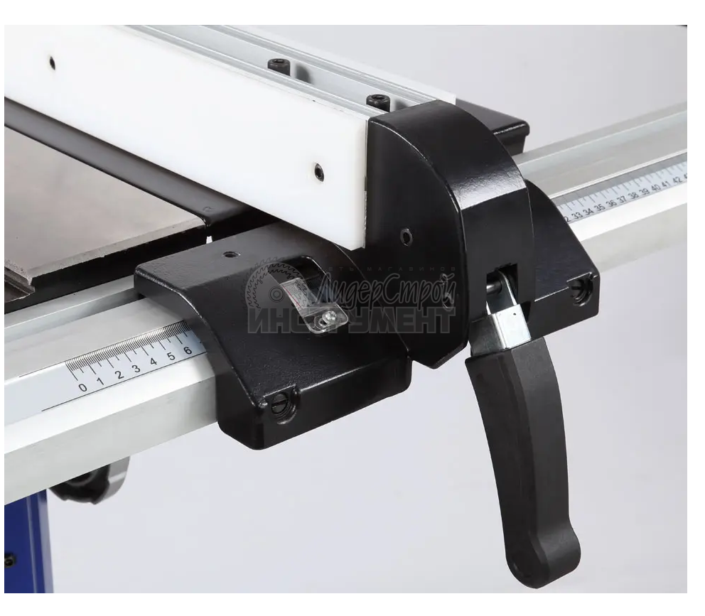 Параллельный упор, выполненный из алюминиевого профиля с накладками из фторопласта, с надежным фиксатором положения на направляющих.