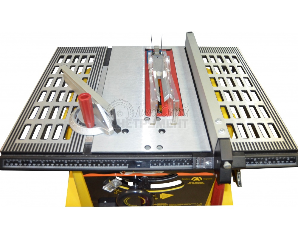 Рабочий стол и дополнительные секции выполнены из чугуна, что придает модели повышенную прочностью и износостойкость. Стол имеет два стандартных паза для установки углового упора или дополнительных приспособлений.