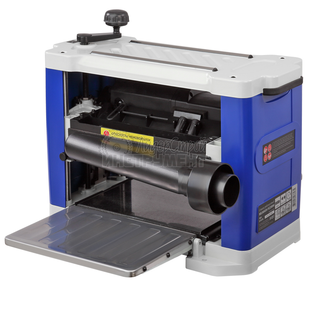 Модель оборудована индикатором строгания, отображающим высоту снятия за один проход, и рукояткой регулировки, перемещающей рабочую платформу. Установка конечной толщины обработки производится рукояткой настройки суммарной глубины строгания, расположенной на правом торце корпуса.