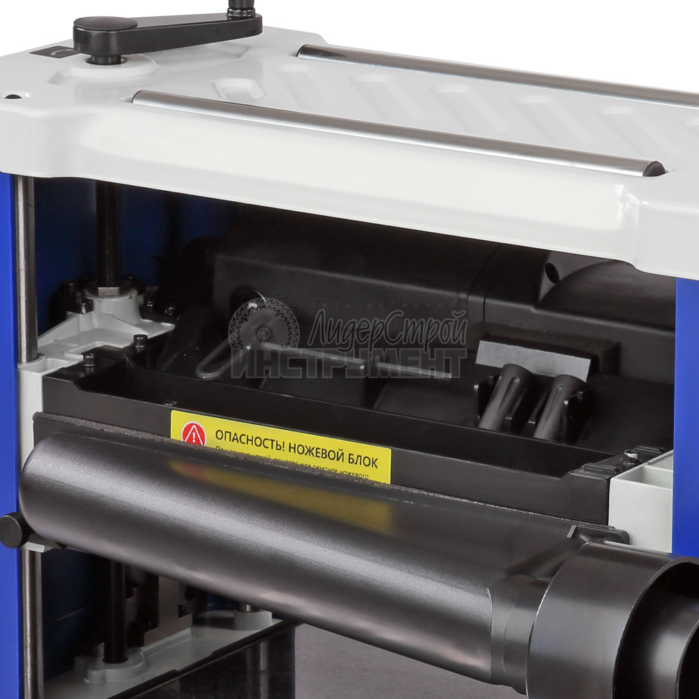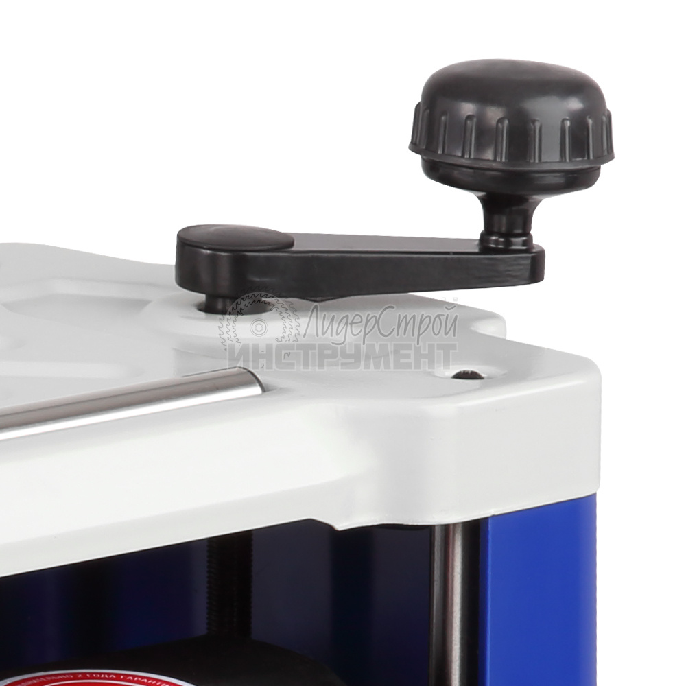 Модель оборудована индикатором строгания, отображающим высоту снятия за один проход, и рукояткой регулировки, перемещающей рабочую платформу. Установка конечной толщины обработки производится рукояткой настройки суммарной глубины строгания, расположенной на правом торце корпуса.