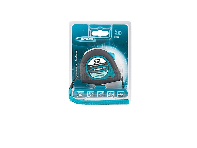 Рулетка GROSS Ergonomisch имеет полотно длиной 5 м и шириной 19 мм. Это комфортный в работе инструмент для измерений в труднодоступных местах. Артикул – 31102.