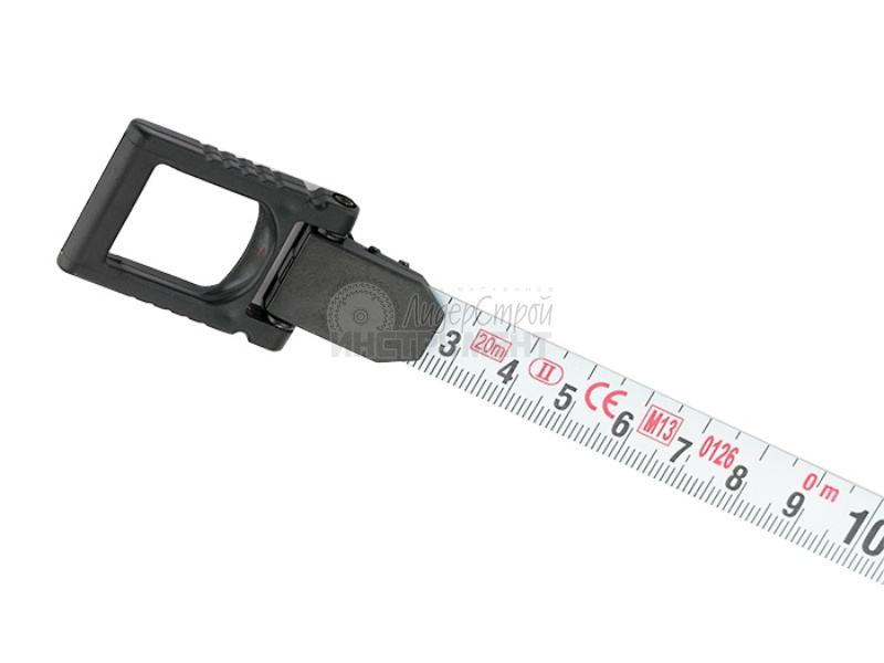 Корпус рулетки из ударопрочного пластика. Двухкомпонентная ручка обеспечивает удобный захват. Имеет заострённый наконечник для фиксации рулетки в почве при проведении длинномерных измерений. Измерительная лента защищена полимерным покрытием, стойким к абразивному воздействию. Цена деления – 1 мм. Класс точности – 2. Предназначена для измерения размеров и расстояний.