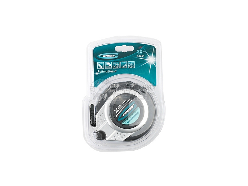 Геодезическая рулетка Rollmasband торговой марки GROSS с измерительным полотном длиной 20 м применяется при проведении замеров на строительных площадках, открытых участках и пр. Рулетка имеет прорезиненный корпус закрытого типа. Ускоренный механизм смотки с передаточным коэффициентом 3 к 1 в рулетке Rollmasband позволяет сматывать полотно в три раза быстрее по сравнению с рулетками, использующими обычный механизм. Рулетка оснащена металлическим полотном, которое со временем не растягивается, в отличие от рулеток с полотном из ПВХ. Дополнительное нейлоновое покрытие защищает полотно от агрессивных воздействий окружающей среды и увеличивает срок службы рулетки в 6 раз по сравнению с обычным окрашиванием.