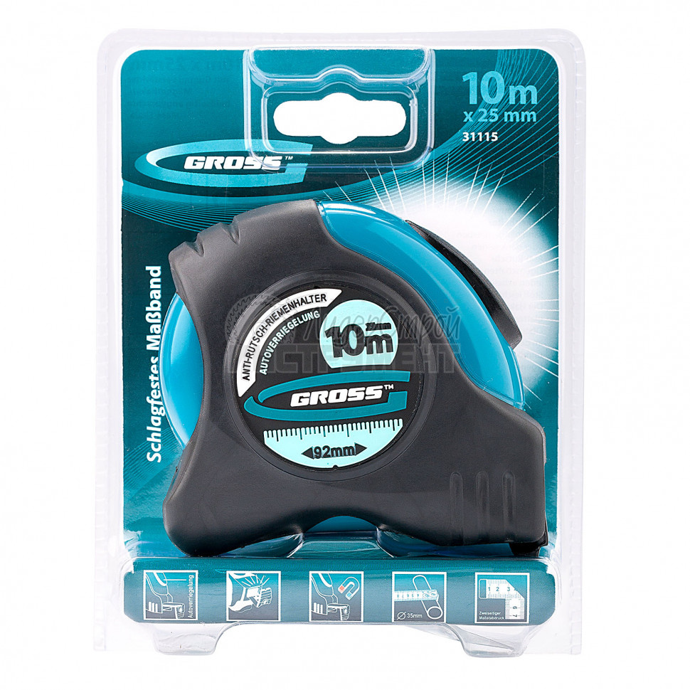 Рулетка Schlagfest торговой марки GROSS относится к карманным рулеткам с автоматической фиксацией измерительного полотна.