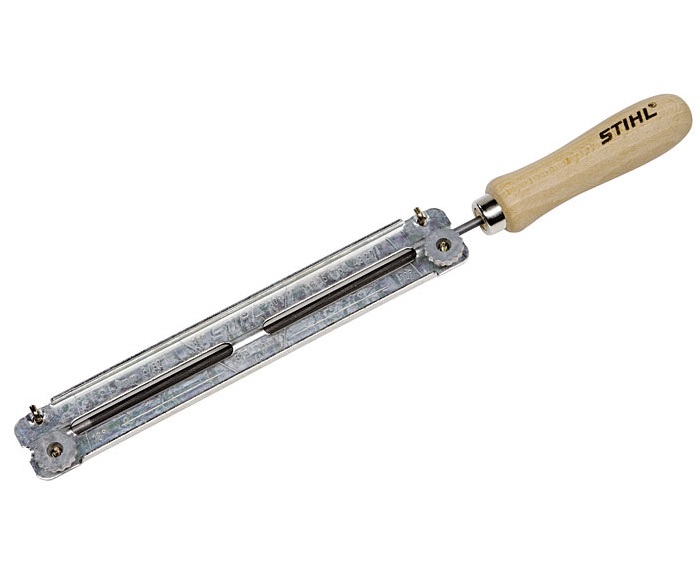 Державка с круглым напильником 3,2 мм 1/4" для дисков с долотообразными зубьями Stihl позволяет вести быструю, легкую и точную заточку пильной цепи под правильным углом и на нужную глубину. Заточка напильником рассчитана специально на то, что напильник выступает на 1/10 над спинкой зуба своего диаметра. Зажимную державку нужно направлять так, чтобы соответствующие обозначения угла заточки 30 град. или 10 град. располагались параллельно направляющей шине. Зажимная державка напильника гарантирует прилегание его на зубе на правильной высоте