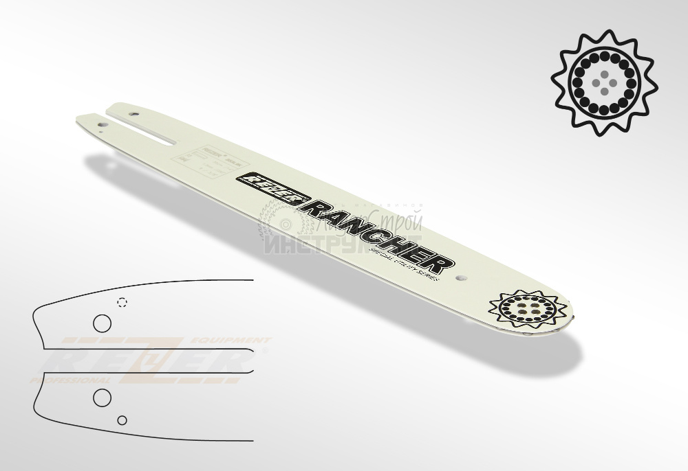 Шины Rezer со стандартным профилем для бензопил любительского и полупрофессионального класса и электропил с мощностью до 2,2 кВт. Имеют усиленное крепление ведомой звездочки, что обеспечивает дополнительную устойчивость к нагрузкам и продлевает срок службы. Так же, как шины с узким профилем, имеют узкий паз (slim) и длину от 35 до 50 см.