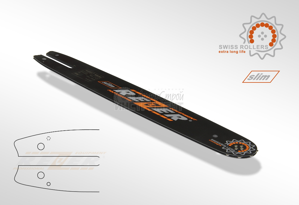 Шины Rezer со стандартным профилем для бензопил любительского и полупрофессионального класса и электропил с мощностью до 2,2 кВт. Имеют усиленное крепление ведомой звездочки, что обеспечивает дополнительную устойчивость к нагрузкам и продлевает срок службы. Так же, как шины с узким профилем, имеют узкий паз (slim) и длину от 35 до 50 см.