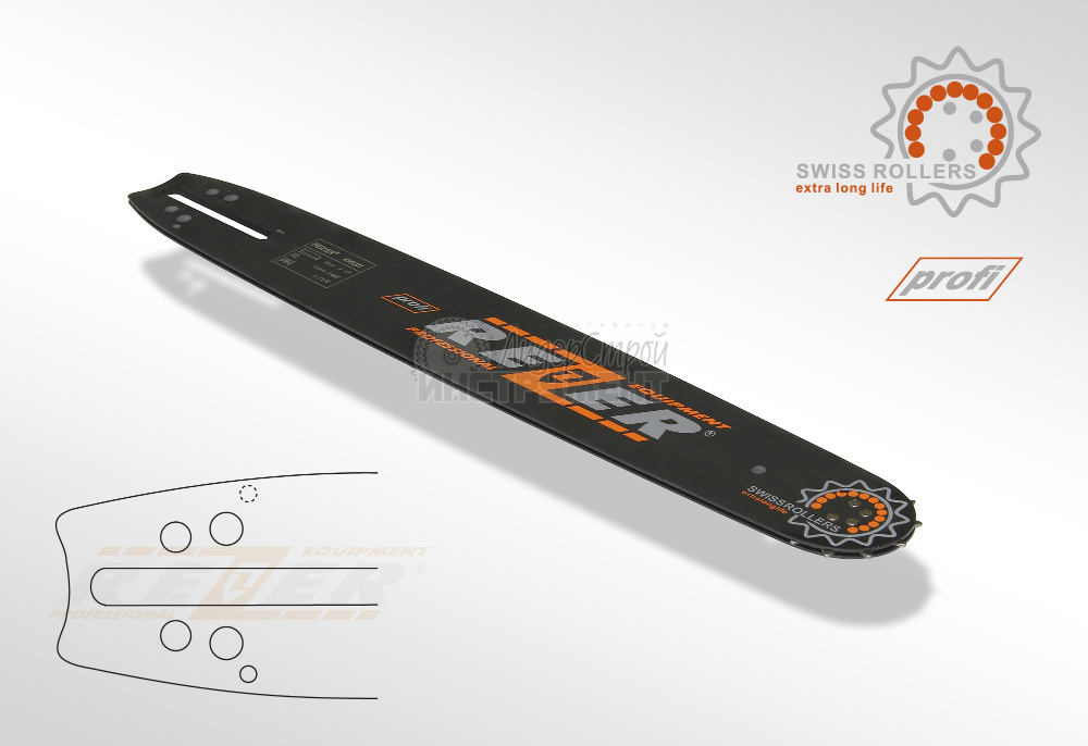 Шины Rezer со стандартным профилем, предназначенные для использования на цепных пилах профессионального класса. Благодаря прочному креплению ведомой звездочки обеспечивается высокая стойкость к нагрузкам и максимальный ресурс. Толщина ведущего звена цепи на направляющих шинах с маркировкой «profi» составляет 1,6 мм/0,063”. Длина от 40 см до 50 см.