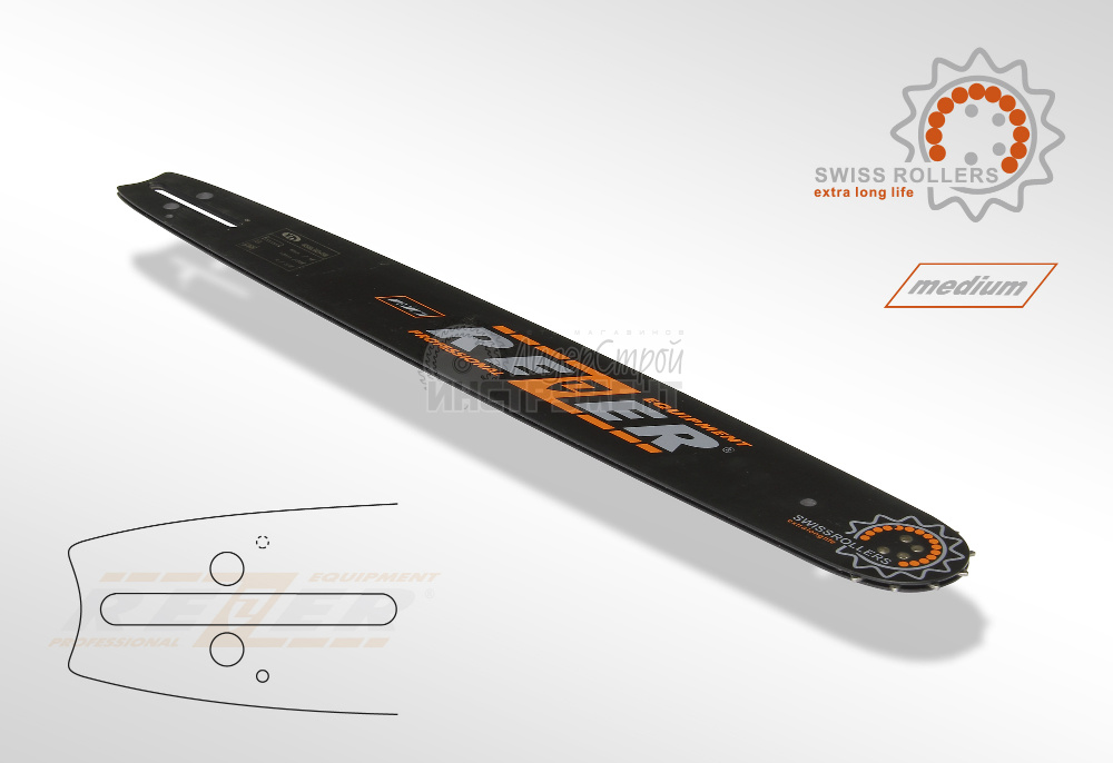Шины Rezer со стандартным профилем для цепных пил полупрофессионального класса. Имеют усиленное крепление ведомой звездочки, что обеспечивает дополнительную устойчивость к нагрузкам и продлевает срок службы. В отличие от направляющих шин с маркировкой «slim», шины с маркировкой «medium» оснащаются более мощной цепью с толщиной ведущего звена 1,5 мм/0,058”. Длина шин от 38 до 50 см.