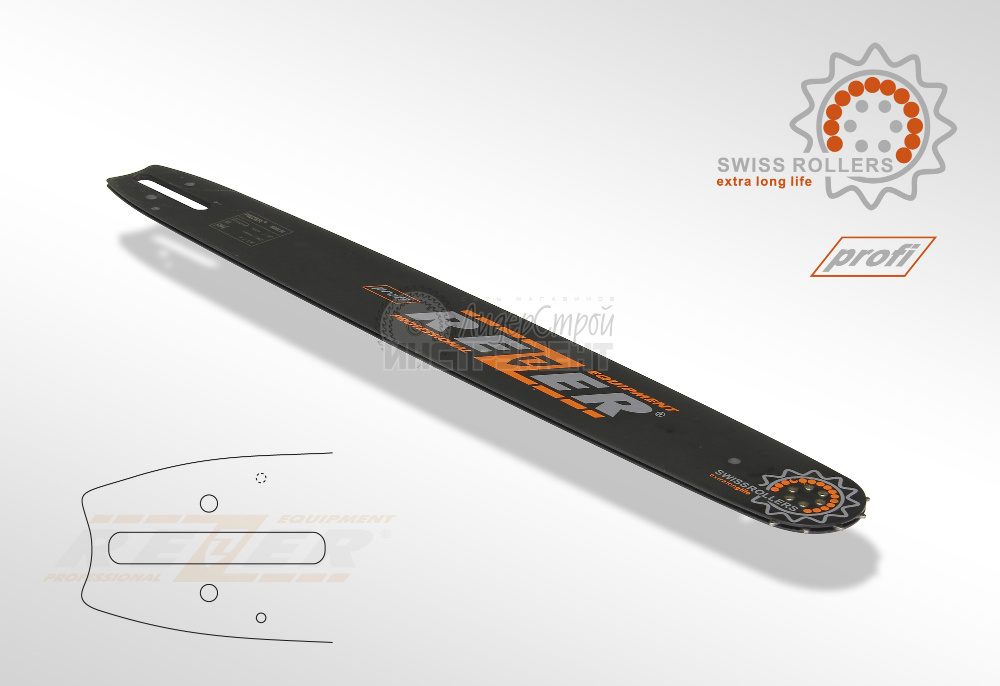 Шины Rezer со стандартным профилем, предназначенные для использования на цепных пилах профессионального класса. Благодаря прочному креплению ведомой звездочки обеспечивается высокая стойкость к нагрузкам и максимальный ресурс. Толщина ведущего звена цепи на направляющих шинах с маркировкой «profi» составляет 1,6 мм/0,063”. Длина от 40 см до 50 см.