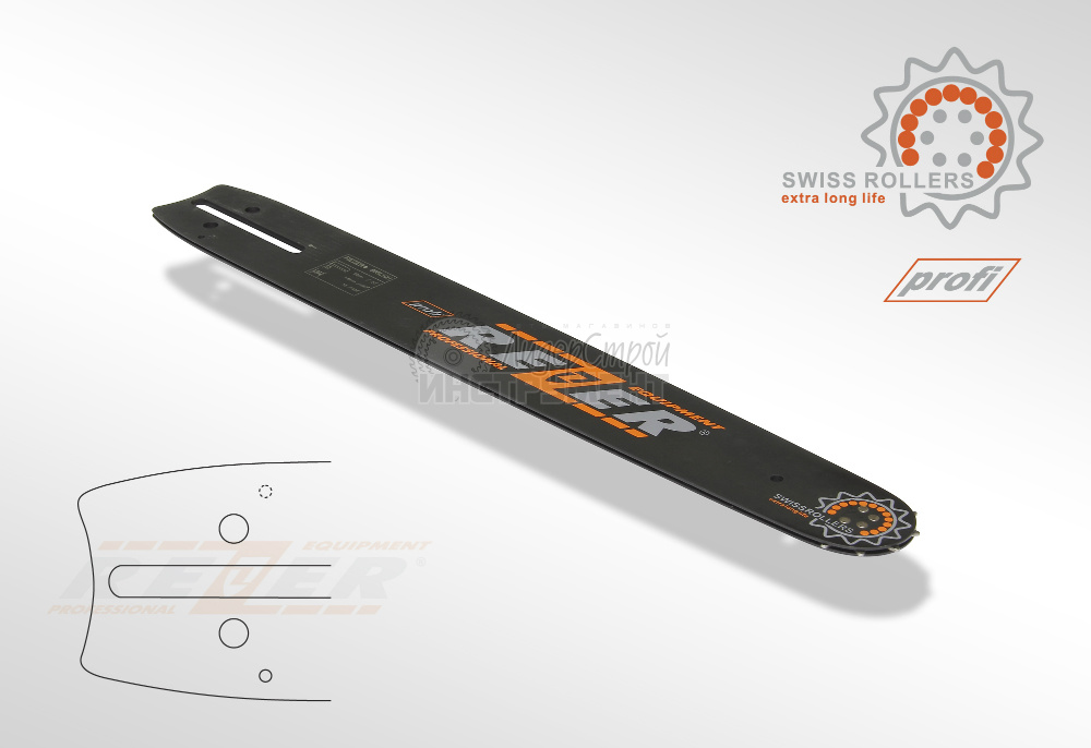Шины Rezer со стандартным профилем, предназначенные для использования на цепных пилах профессионального класса. Благодаря прочному креплению ведомой звездочки обеспечивается высокая стойкость к нагрузкам и максимальный ресурс. Толщина ведущего звена цепи на направляющих шинах с маркировкой «profi» составляет 1,6 мм/0,063”. Длина от 40 см до 50 см.