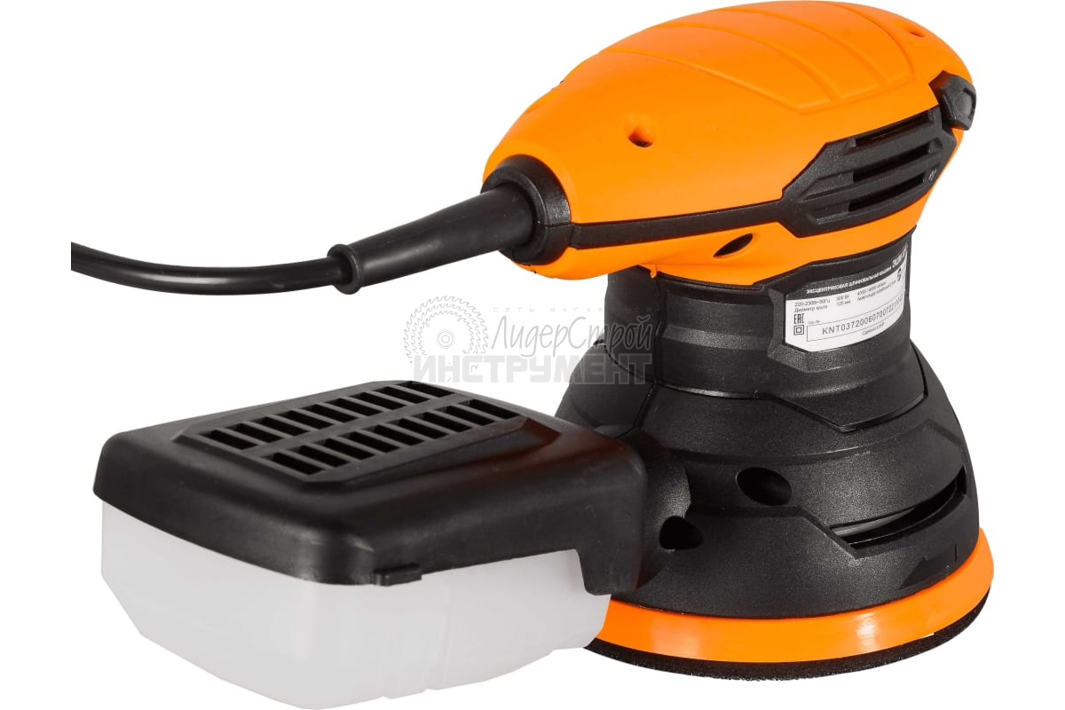 Качество работ обеспечивается сочетанием эксцентрикового и вращательного движения опорной тарелки. Диаметр шлифовальной оснастки — 125 мм.