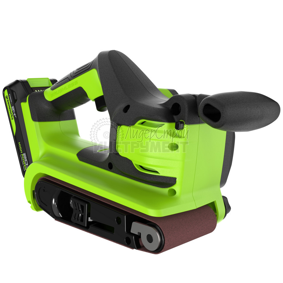 Ленточная шлифовальная машина аккумуляторная Greenworks G24BS, 24V, б/щет, 75х457мм, 259 м/мин,1х2Ач, ЗУ - разработана для обработки широкого спектра материалов: древесина и все её производные, пластик, металл, изделия с покрытием шпоном.