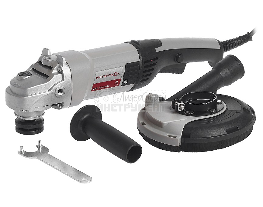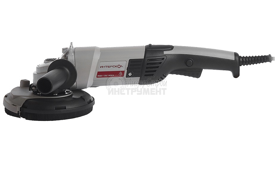 Шлифовальная машина МШУ-125/1400Э от Интерскол мощностью 1400 Вт демонстрирует все признаки профессионального инструмента. Специальный кожух защищает от разлетающейся пыли, трансформируется под стачивание углов, предотвращает попадание пыли в двигатель. Из списка достоинств аппарата отметим наиболее важные: