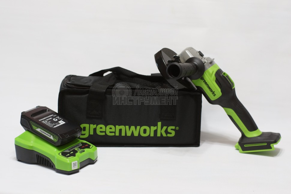 Угловая шлифовальная машина (болгарка) GreenWorks 24V (модель GD24AG) - предназначена резки и шлифования металла. Мощный бесщеточный двигатель работает от аккумулятора 24В, что определяет высокую производительность и скорость реза.
