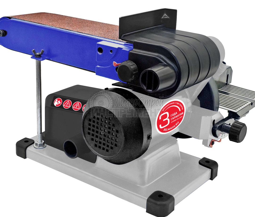 Конструктивно он представляет собой шлифовальный блок с приводом и двумя рабочими столами, размещенными на основании. У ленточного блока предусмотрена регулировка угла наклона от 0 до 90 градусов. Рассчитан на подключение к сети 400 В. Имеется аналогичная модель BELMASH EOS-91 для подключения к электросети 230 В.
