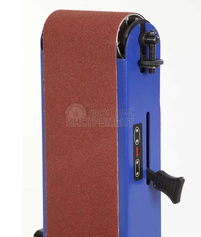 В движение ленту приводит трехфазный асинхронный двигатель мощностью 2200 Вт. Ее скорость движения 16 м/с. Механизм осцилляции улучшает качество процесса шлифования. Амплитуда колебаний -12,5 мм. Поэтому при ширине ленты 152 мм максимальная высота обработки составляет 160 мм. Рабочие столы выполнены из чугуна и прошли фрезерное шлифование, имеют регулировку по высоте. В паз основного рабочего стола можно установить параллельную направляющую или угловой упор. Это позволяют обрабатывать не только канты, но и пласть. Малый стол позволяет совершать шлифование заготовок с внутренним закруглением радиусом до 55 мм.
