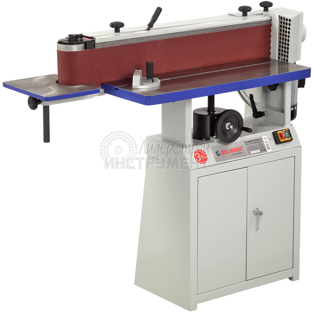 Конструктивно он представляет собой шлифовальный блок с приводом и двумя рабочими столами, размещенными на основании. У ленточного блока предусмотрена регулировка угла наклона от 0 до 90 градусов. Рассчитан на подключение к сети 400 В. Имеется аналогичная модель BELMASH EOS-91 для подключения к электросети 230 В.