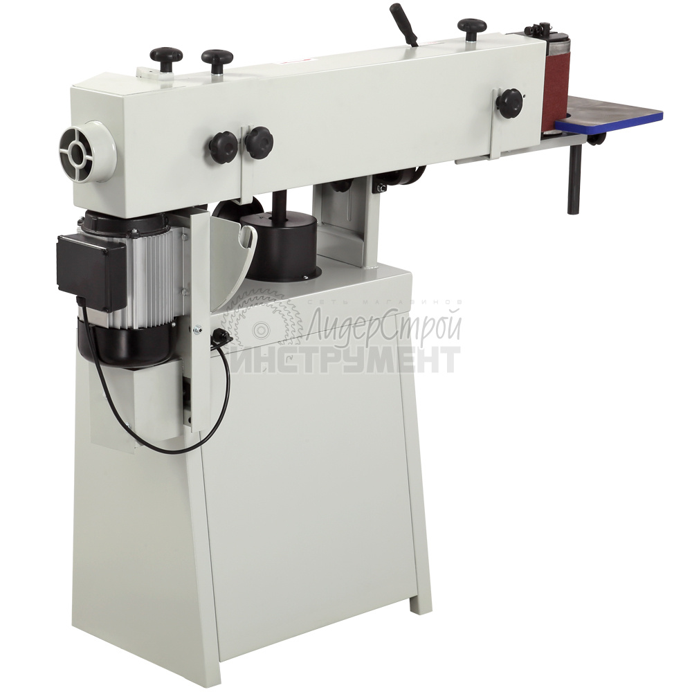 В движение ленту приводит однофазный асинхронный двигатель мощностью 2200 Вт. Ее скорость движения 16 м/с. Механизм осцилляции улучшает качество процесса шлифования. Амплитуда колебаний -12,5 мм. Поэтому при ширине ленты 152 мм максимальная высота обработки составляет 160 мм. Рабочие столы выполнены из чугуна и прошли фрезерное шлифование, имеют регулировку по высоте. В паз основного рабочего стола можно установить параллельную направляющую или угловой упор. Поэтому можно обрабатывать не только канты, но и пласть. Назначение малого стола - шлифование заготовок с внутренним радиусом закругления до 55 мм.