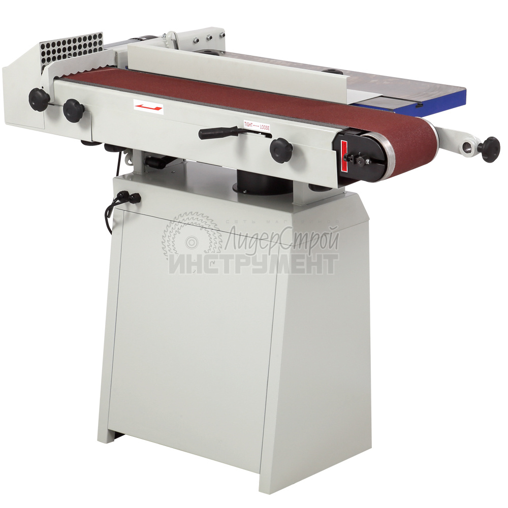В движение ленту приводит однофазный асинхронный двигатель мощностью 2200 Вт. Ее скорость движения 16 м/с. Механизм осцилляции улучшает качество процесса шлифования. Амплитуда колебаний -12,5 мм. Поэтому при ширине ленты 152 мм максимальная высота обработки составляет 160 мм. Рабочие столы выполнены из чугуна и прошли фрезерное шлифование, имеют регулировку по высоте. В паз основного рабочего стола можно установить параллельную направляющую или угловой упор. Поэтому можно обрабатывать не только канты, но и пласть. Назначение малого стола - шлифование заготовок с внутренним радиусом закругления до 55 мм.
