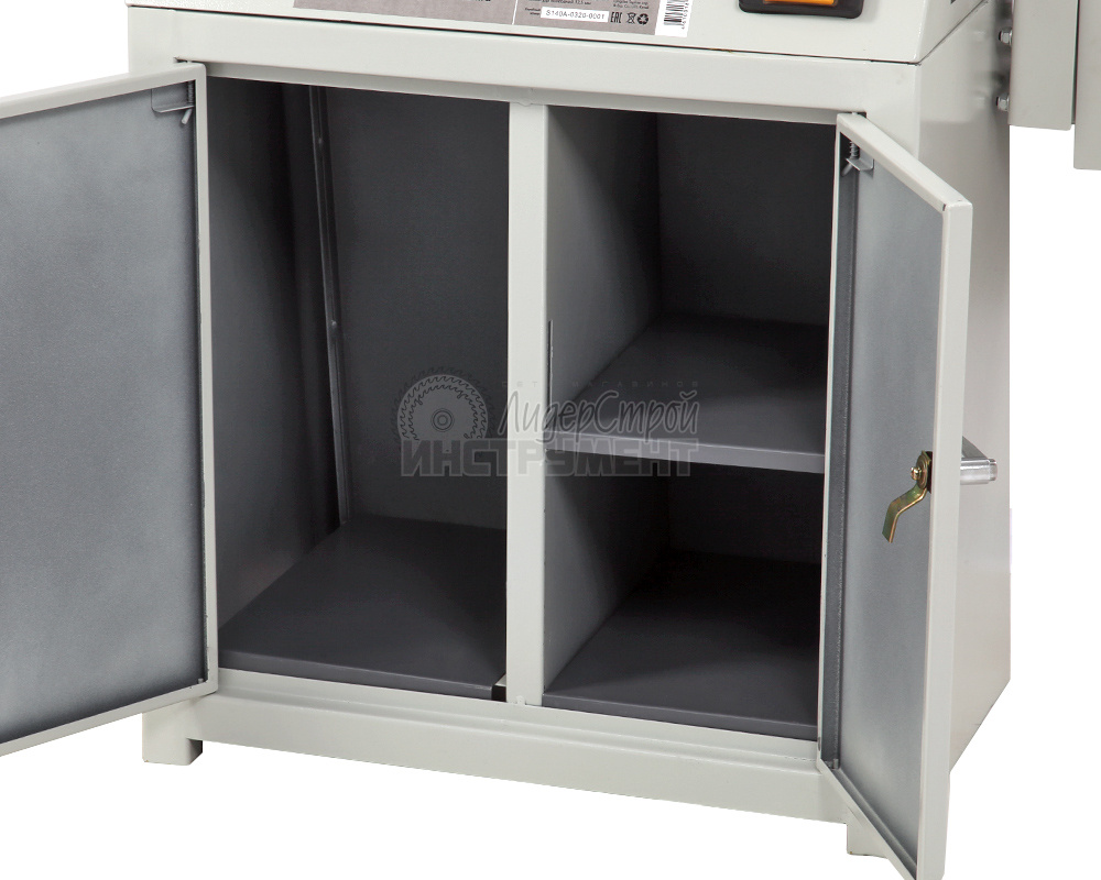 Особого внимания заслуживает основание станка. Оно полностью закрыто и имеет распашные дверки в передней части. Внутри установлена полка, что позволяет использовать пространство под станиной для хранения принадлежностей и инструмента.