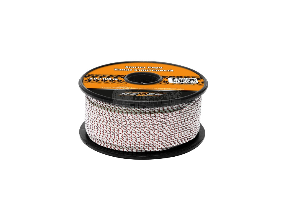 Стартерный шнур производства REZER используется для ручного запуска двухтактных и четырехтактных двигателей садовой и уборочной техники (бензопилы, газонокосилки, генераторы и пр.). Артикул 03.011.00004.