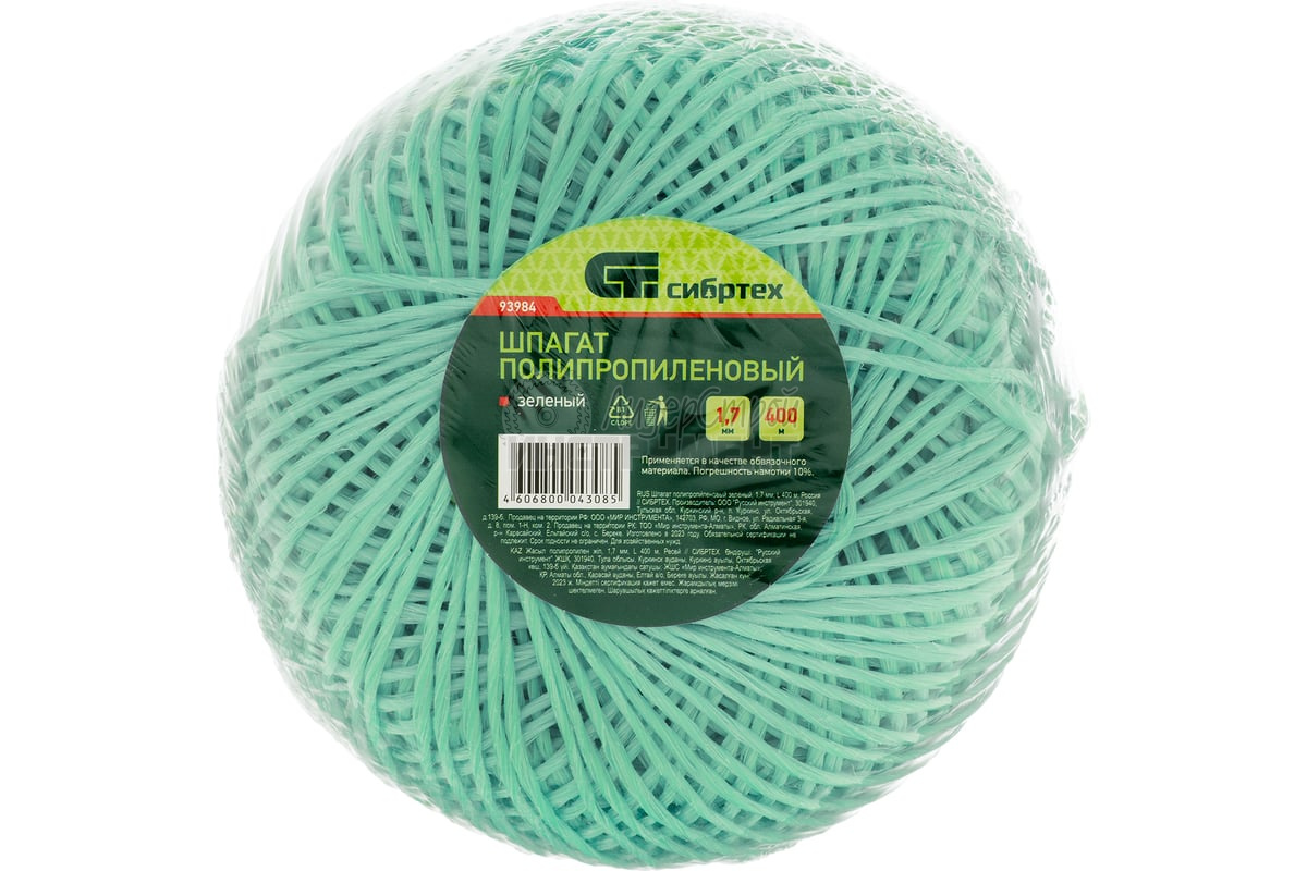 Зеленый полипропиленовый шпагат Сибртех 93984 диаметром 1,7 мм и длиной 400 м используется для упаковки грузов, связывания предметов, подвязки растений и решения других задач.