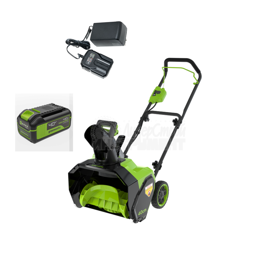 Снегоуборщик аккумуляторный Greenworks Арт. 2603607UB, 40V, 40 см, с 1хАКБ 4 Ач и ЗУ — лёгкое решение для уборки свежего снега перед домом, гаражом, на верандах, патио и декоративных дорожках.