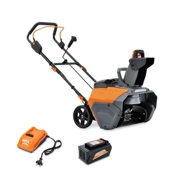 - Мощный аккумулятор 40V – время работы до 45 минут непрерывной работы* (*в зависимости от емкости аккумулятора, объема и плотности снега)