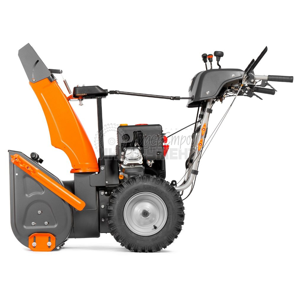 Элементы управления агрегатом расположены на рукоятке. Ручки переключения передач, установки направления выброса снега размещены на корпусе.