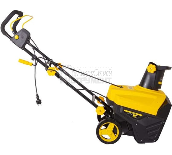 Устройство работает на базе электрического синхронного щеточного двигателя мощностью 2500 Вт со скоростью 3000 об./мин. Ширина захвата снежной массы составляет 50 см, высота – 30 см. Захваченный снег аккуратно отбрасывается в сторону. Корпус с ковшом установлен на металлическую раму и оснащен 2 широкими колесами. Модель несамоходная, однако удобная конструкция, наличие колес и длинной ручки обеспечивают комфортность ее передвижения оператором по относительно твердым поверхностям. Сборная металлическая ручка имеет оптимальную высоту, верхняя часть загнута и оснащена прорезиненным покрытием, исключающим скольжение и промерзание. Рычаг управления вынесен в верхнюю зону рукоятки в пределах досягаемости руки. Снегоуборщик электрический оснащен двумя фарами для удобства работы в темноте. Агрегат весит 15,8 кг, отличается компактными размерами, удобен в хранении и использовании на небольших и нестандартных по конфигурации участках.